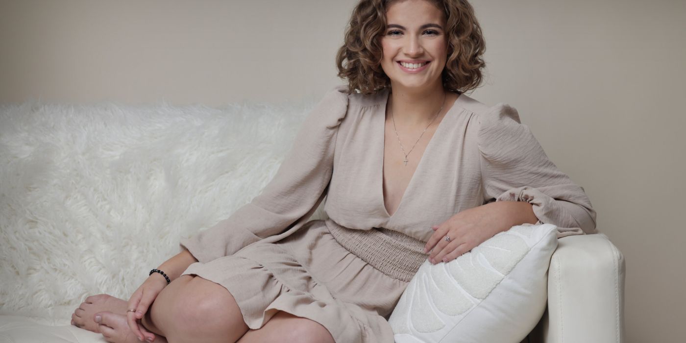 High school age caucasion girl with curly light brown hair sitting on a white couch leaning in the arm with her elbow. her feet are tucked under her